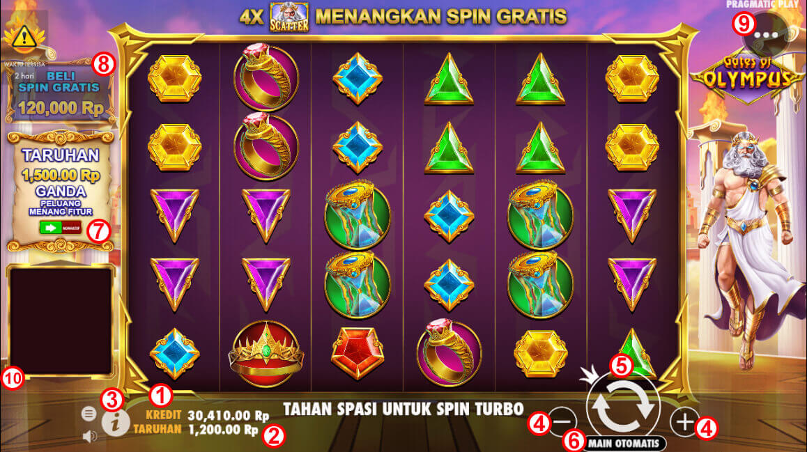 - Taruhan Ganda. Berfungsi untuk menaikkan peluang mendapatkan symbol Scatter dan nilai betting akan mengikuti nilai yang tertera di menu Taruhan Ganda.